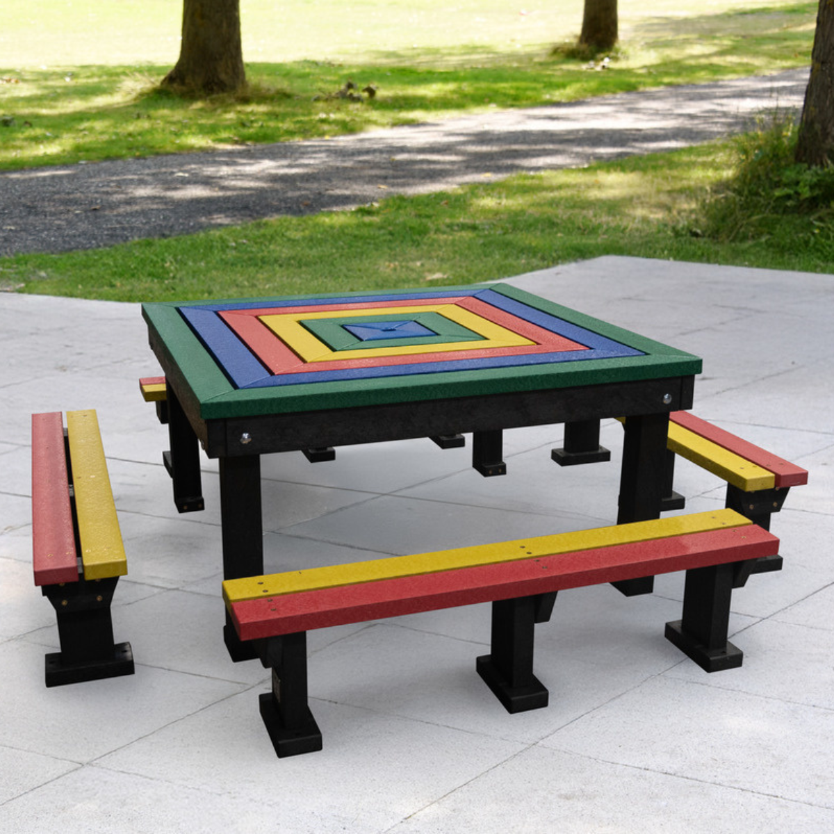 Junior colourful recycled plastic picnic bench with square table and integral bench seating.