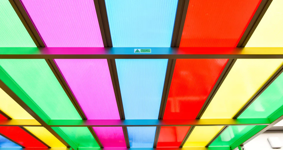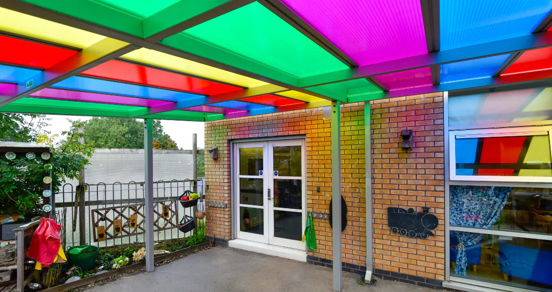 The roof features a 16mm clear structured multi-wall polycarbonate system, chosen for its excellent light transmission and impact resistance. The addition of rainbow colours creates a stunning visual effect as sunlight filters through the vibrant hues. The result is a space that feels bright, welcoming, and full of energy, perfectly reflecting the spirit of the school.