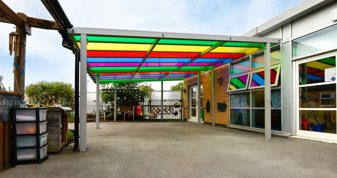 The school wanted to create a sheltered outdoor zone where children could learn, play, and socialise while staying protected from the weather all year-round. Our solution was a custom-designed rainbow Newcastle Monopitch Shelter that brings a splash of colour and creativity to the playground.