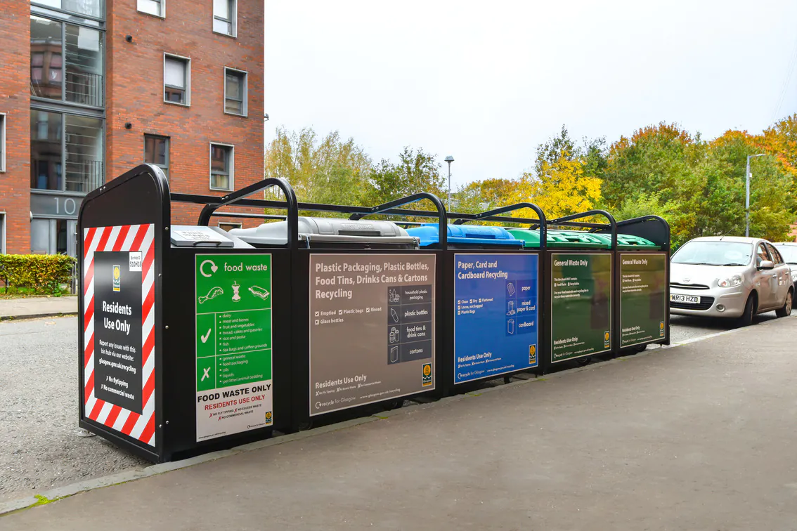 Our 5-bay bin hubs with dedicated food-waste bays are streamlining recycling and improving waste management across Glasgow.