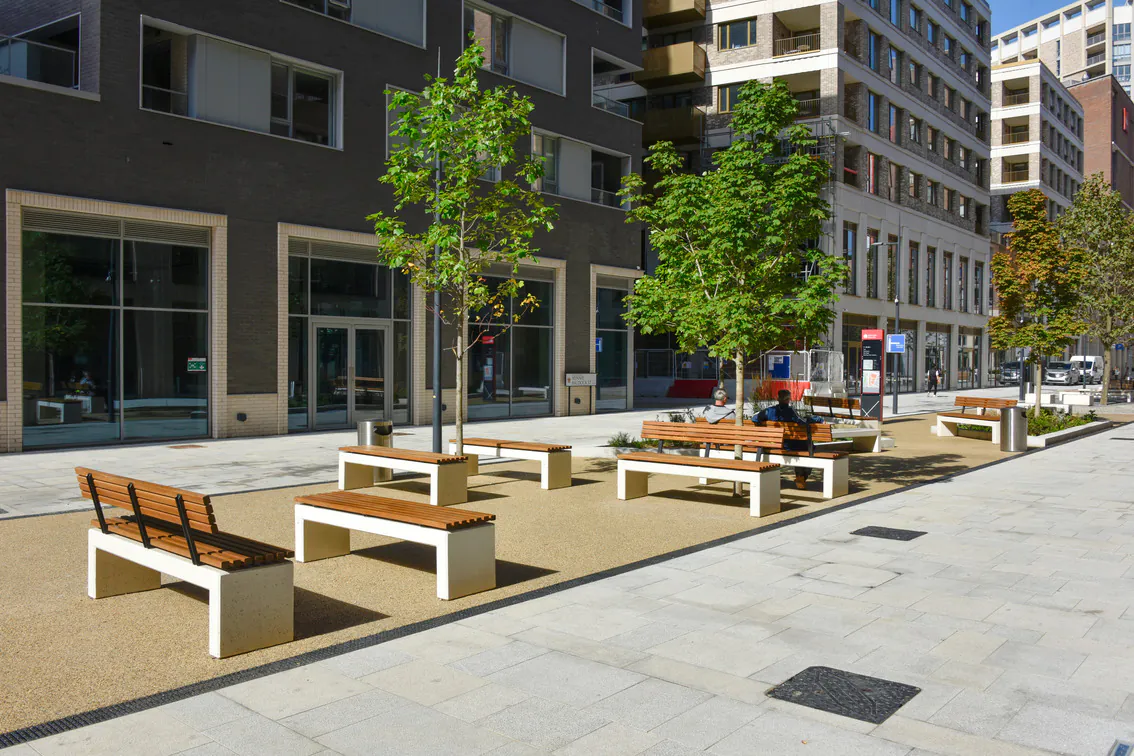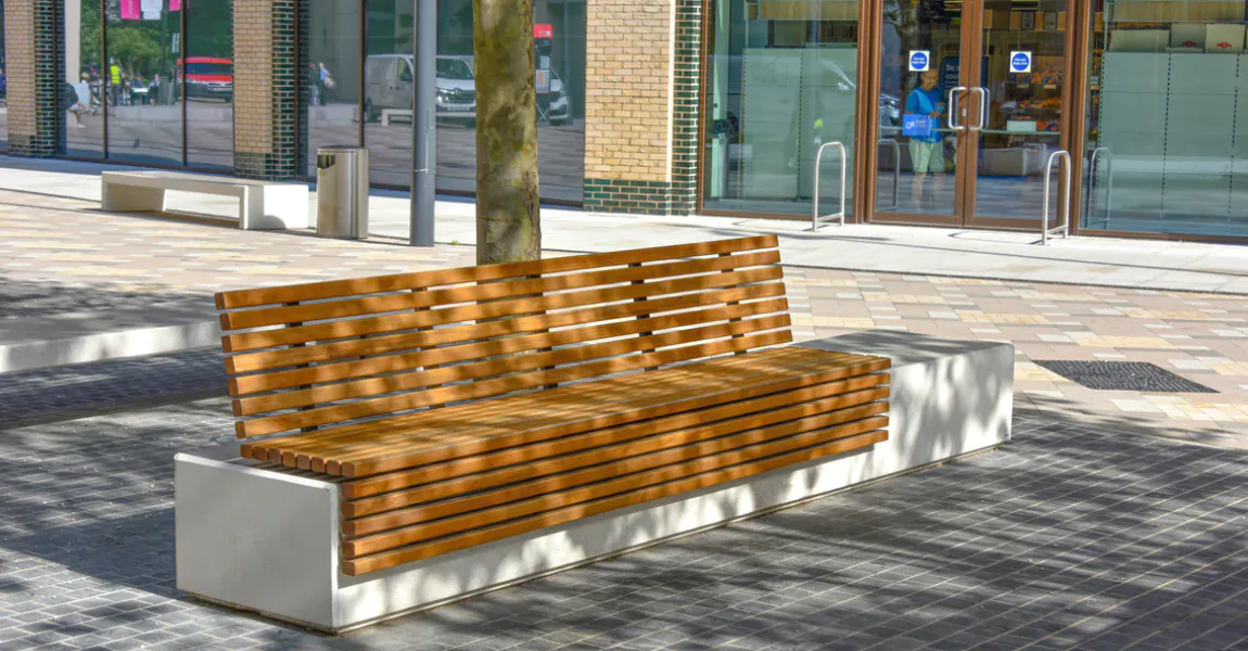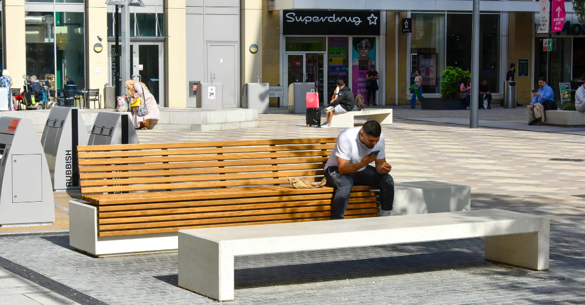 In collaboration with NAO Landscapes, Broxap supplied a diverse range of products that contributed to the creation of vibrant public spaces, including a new civic square and park, surrounded by retail, cafes, and restaurants with outdoor dining areas.