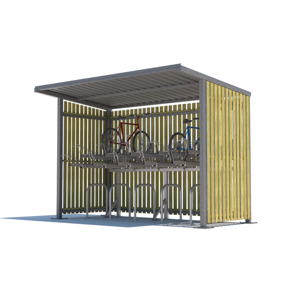 The Blox A cycle shelter is a timber and steel framed shelter which is available for 20 or 24 cycles using the Two tier Bike Racks. This shelter can also provide a multi purpose solution for different eventualities inclusive of but not limited to handwashing stations and more.