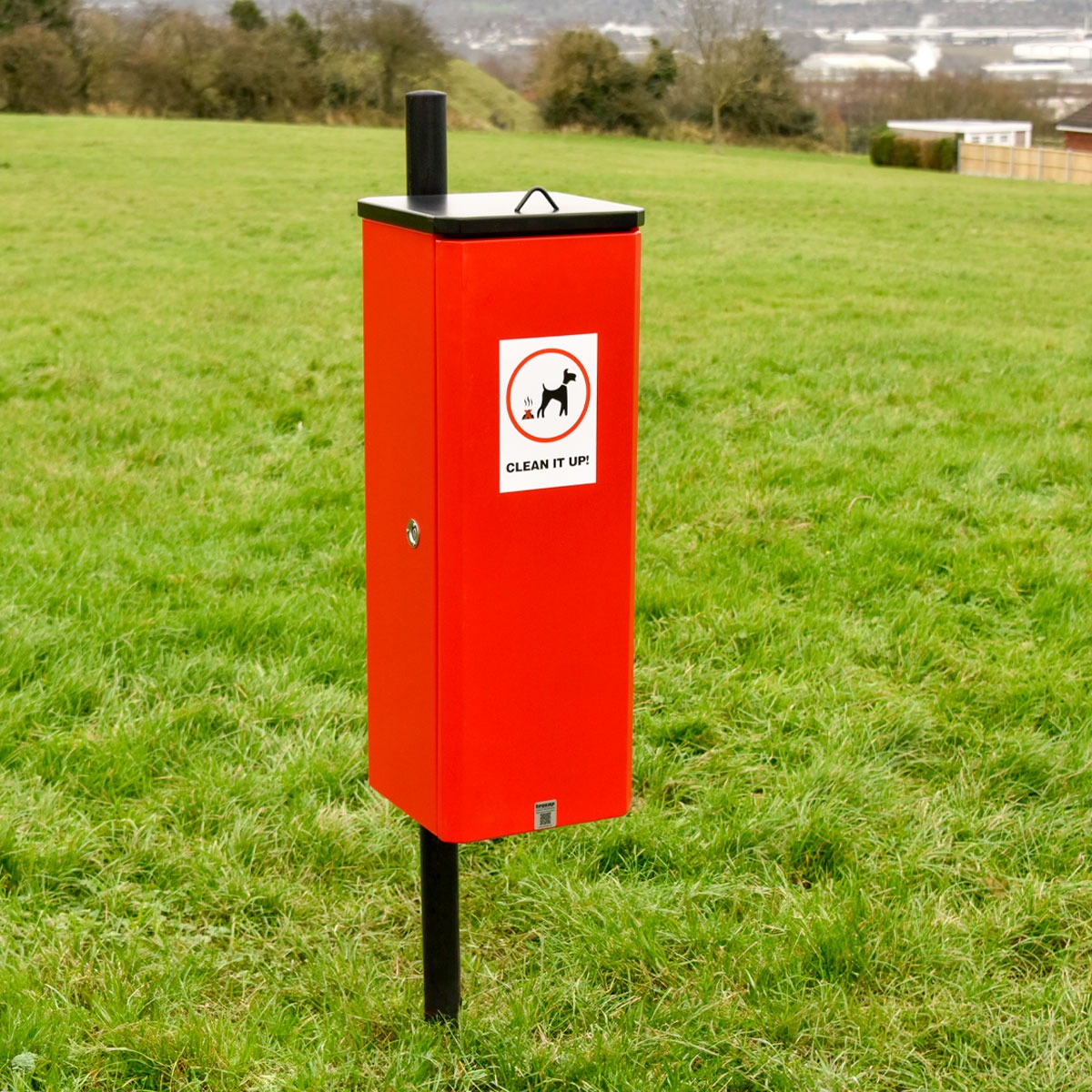 Finished in red with a contrasting black lid, this red dog waste bin offers high visibility, helping users quickly identify the correct disposal point. The colourway is widely recognised in public realm settings and aligns well with existing street furniture palettes.