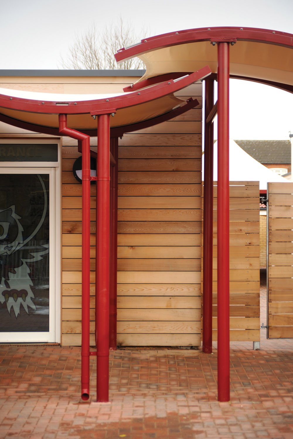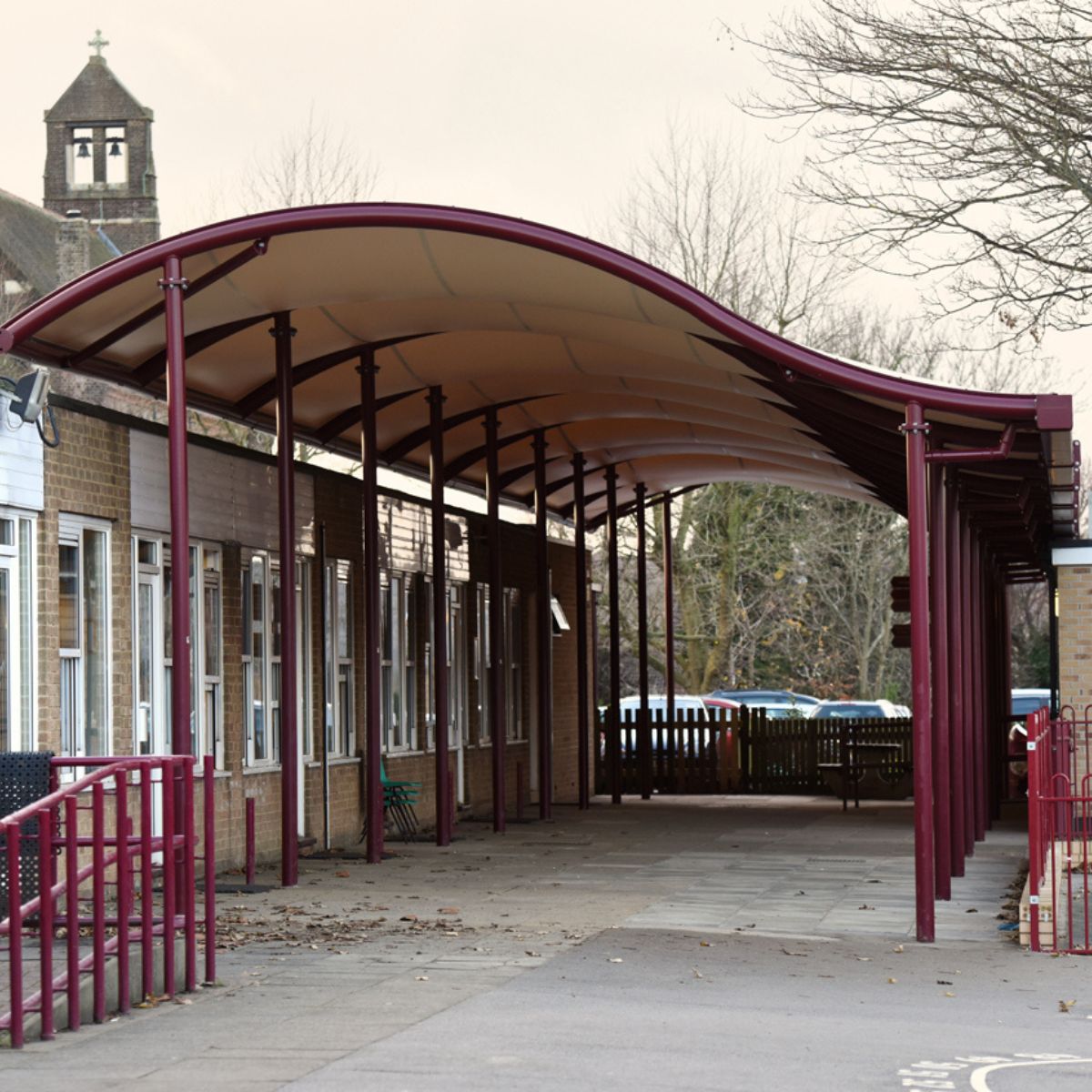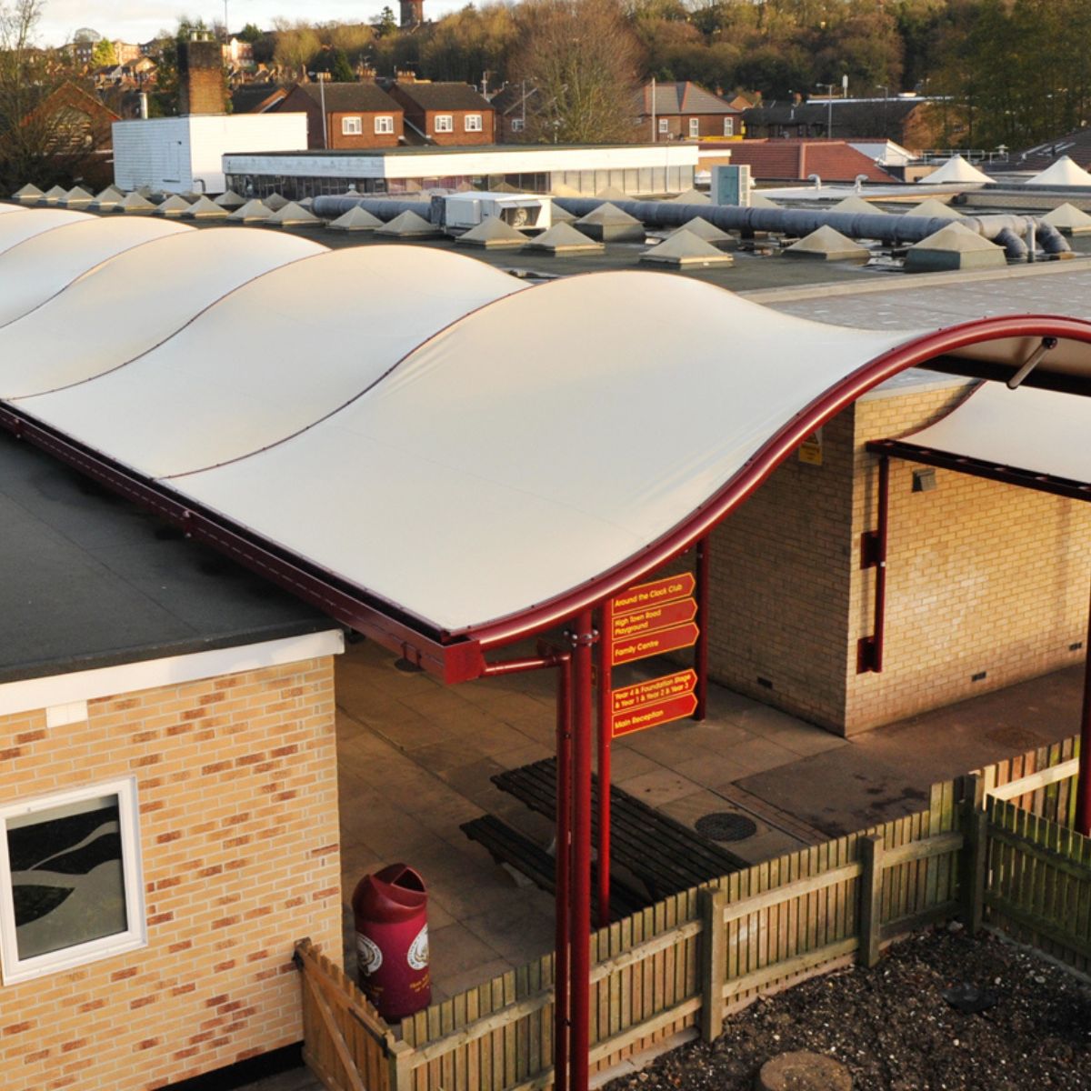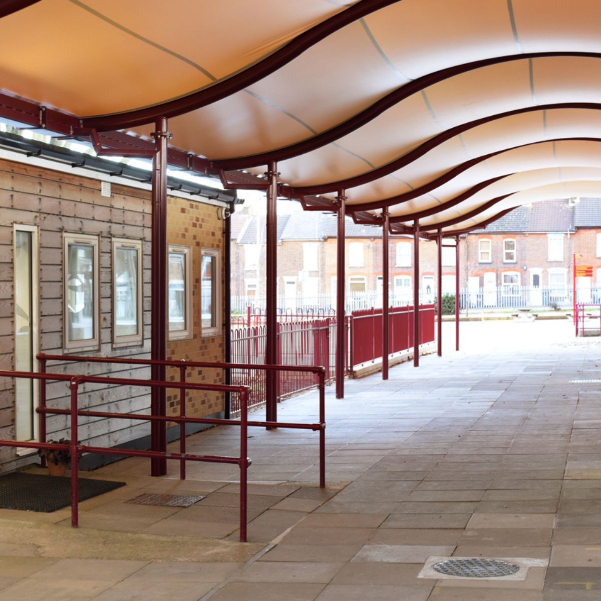 A waterproof tensile white fabric canopy, the Mexican Wave Entrance Canopy provides a stylish alternative to the Polycarbonate and Glazed entrance canopies. Also available as a continuous walkway.