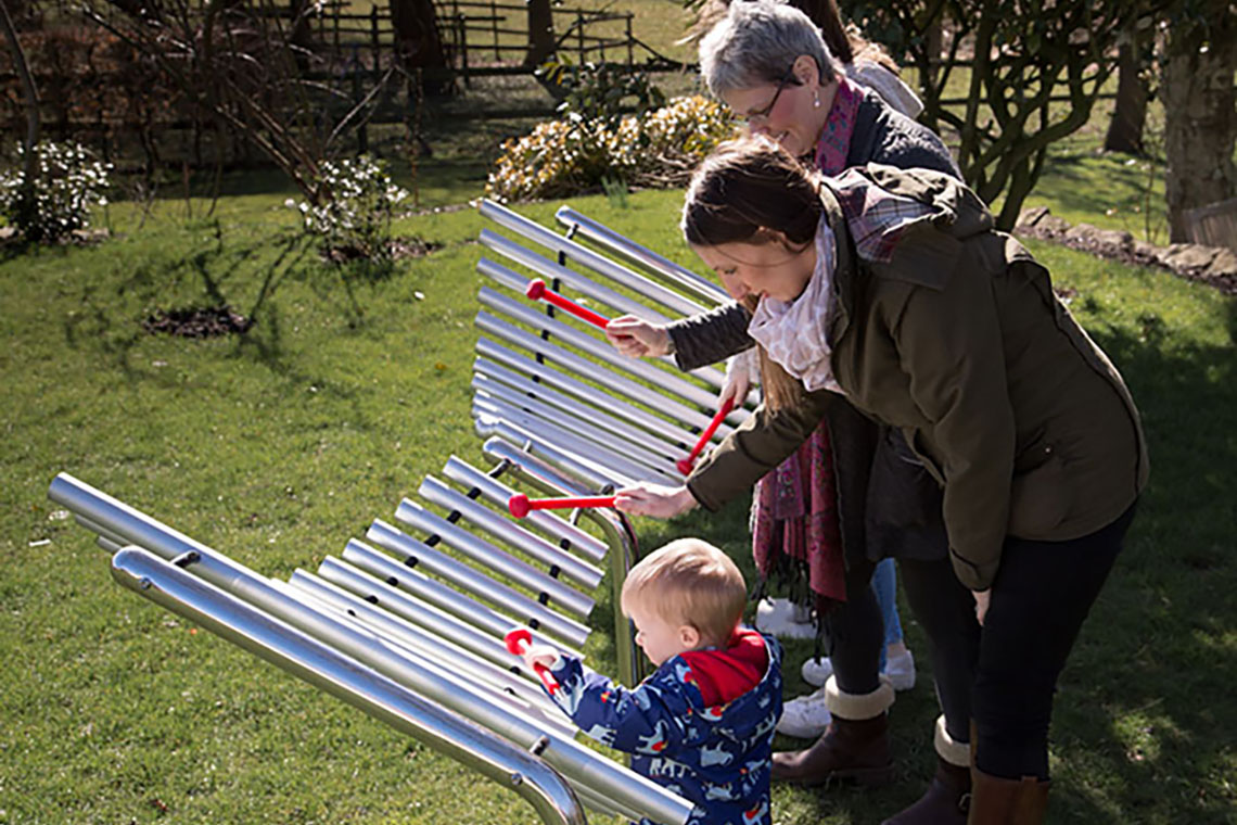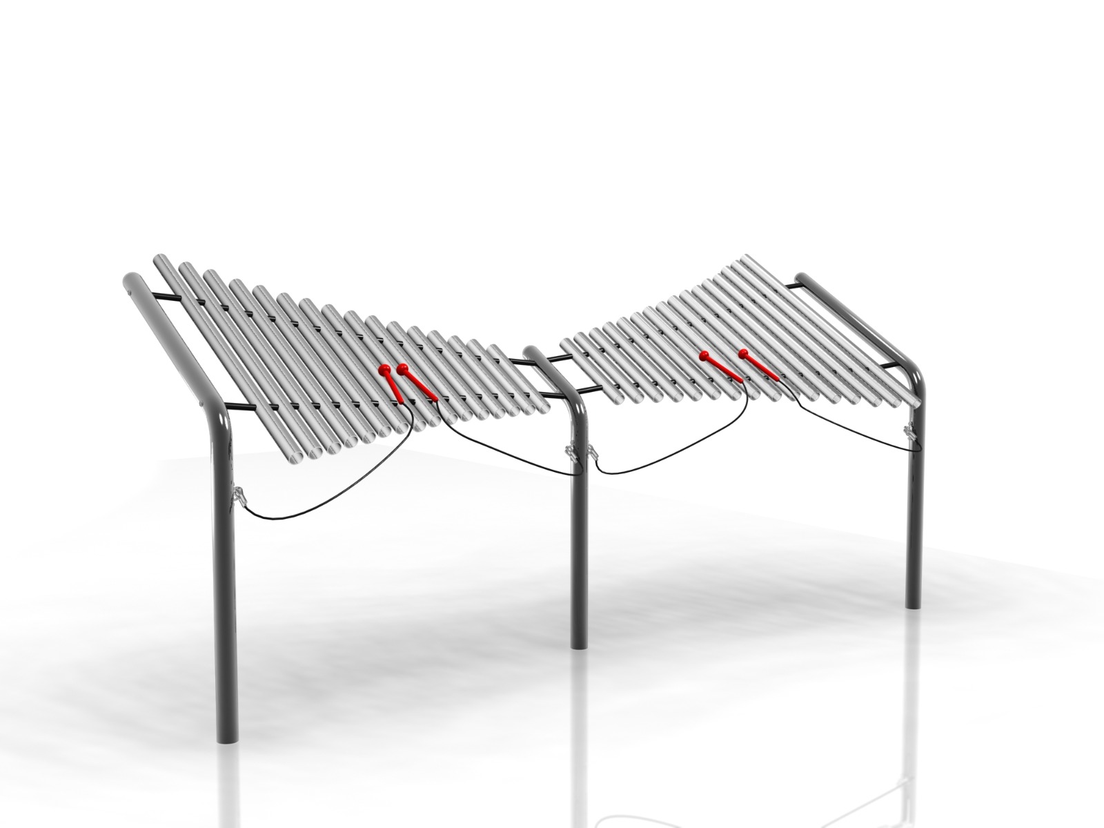 Papilio is a tubular bell type metallophone constructed using notes of anodised aluminium tubes, suspended by stainless steel cables on a stainless steel frame.