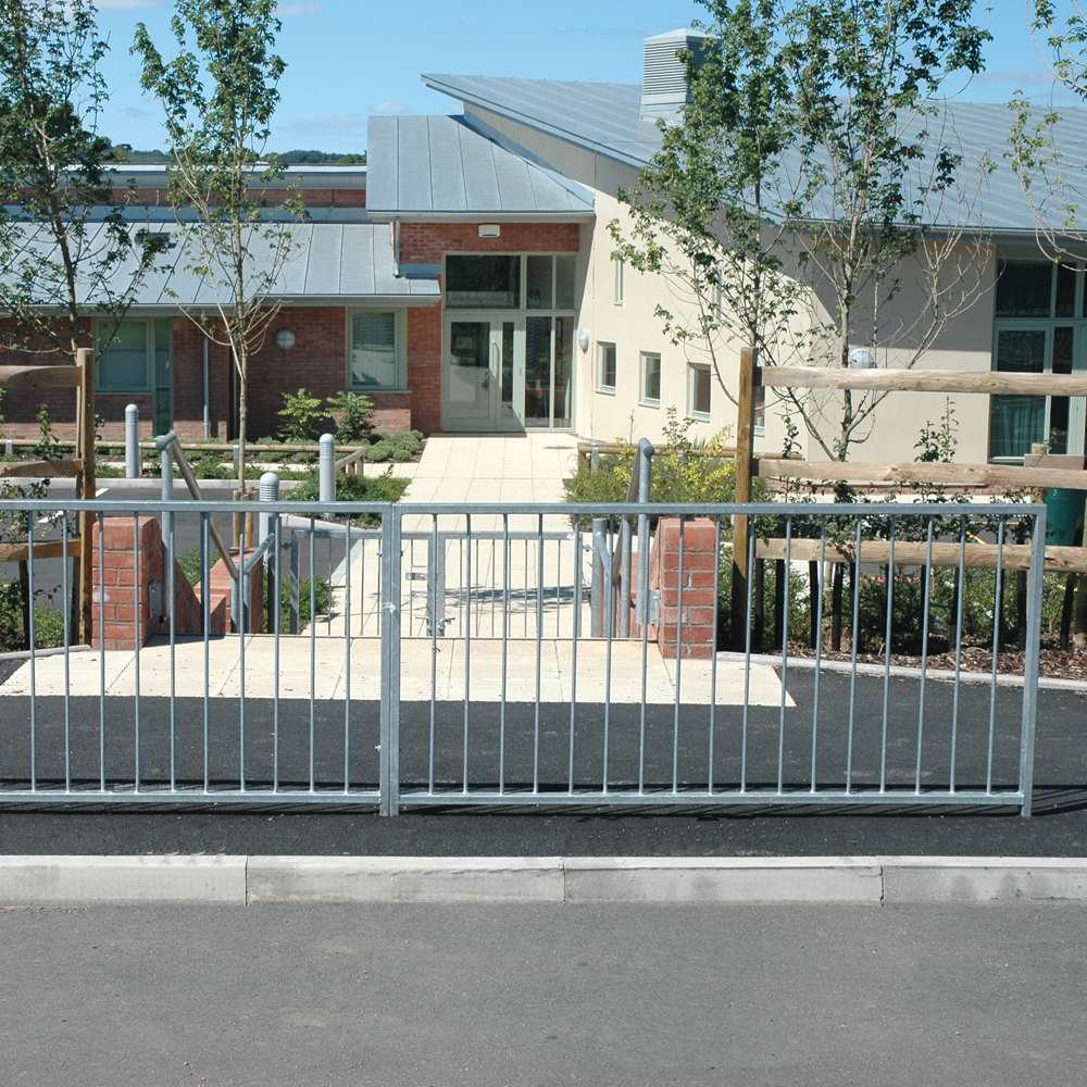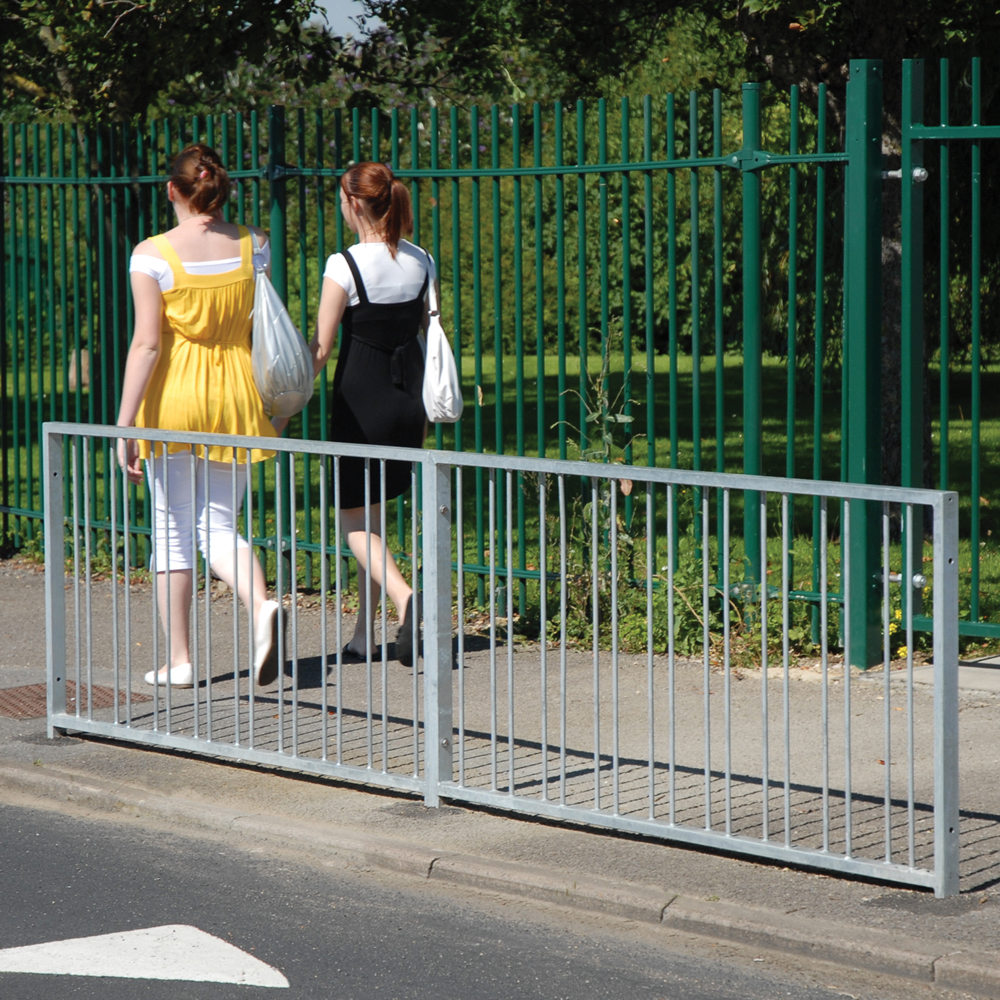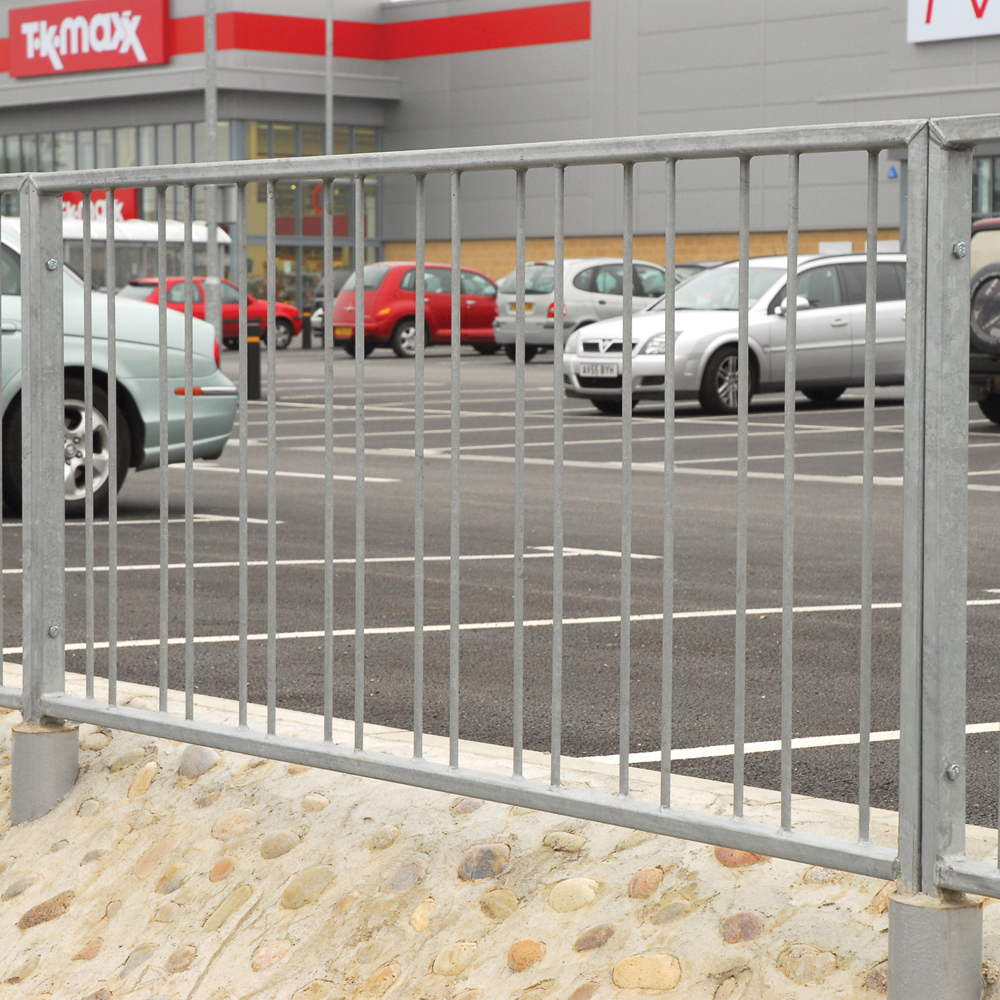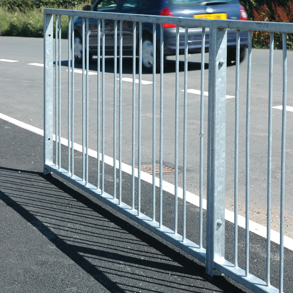 High visibility pedestrian guardrail manufactured from 50 x 30mm box section steel with 12mm infill bars (16mm on request).
