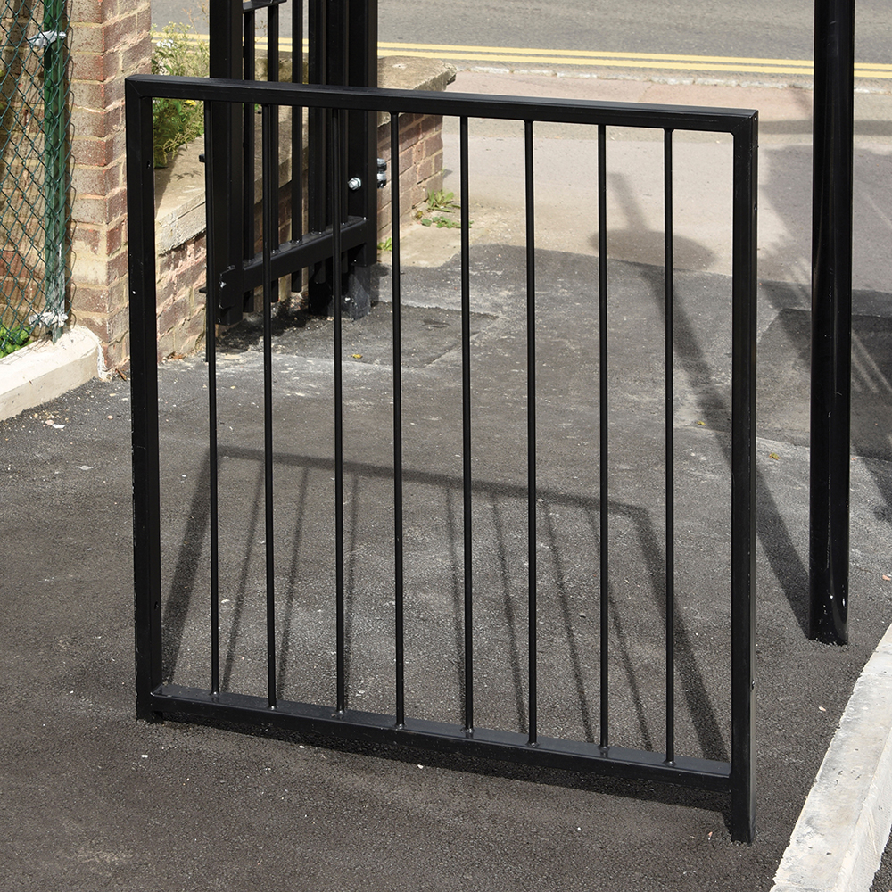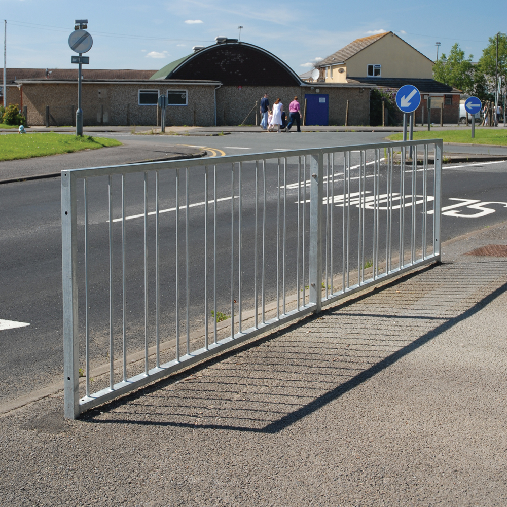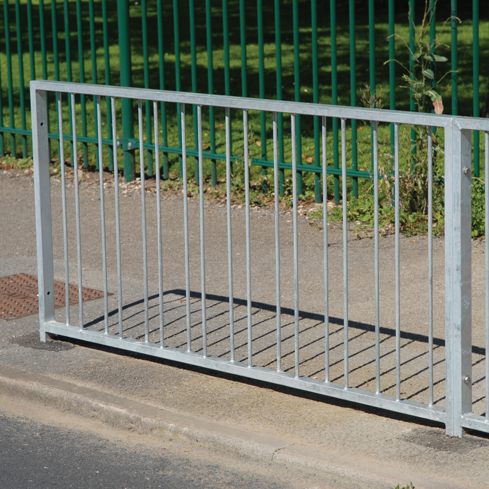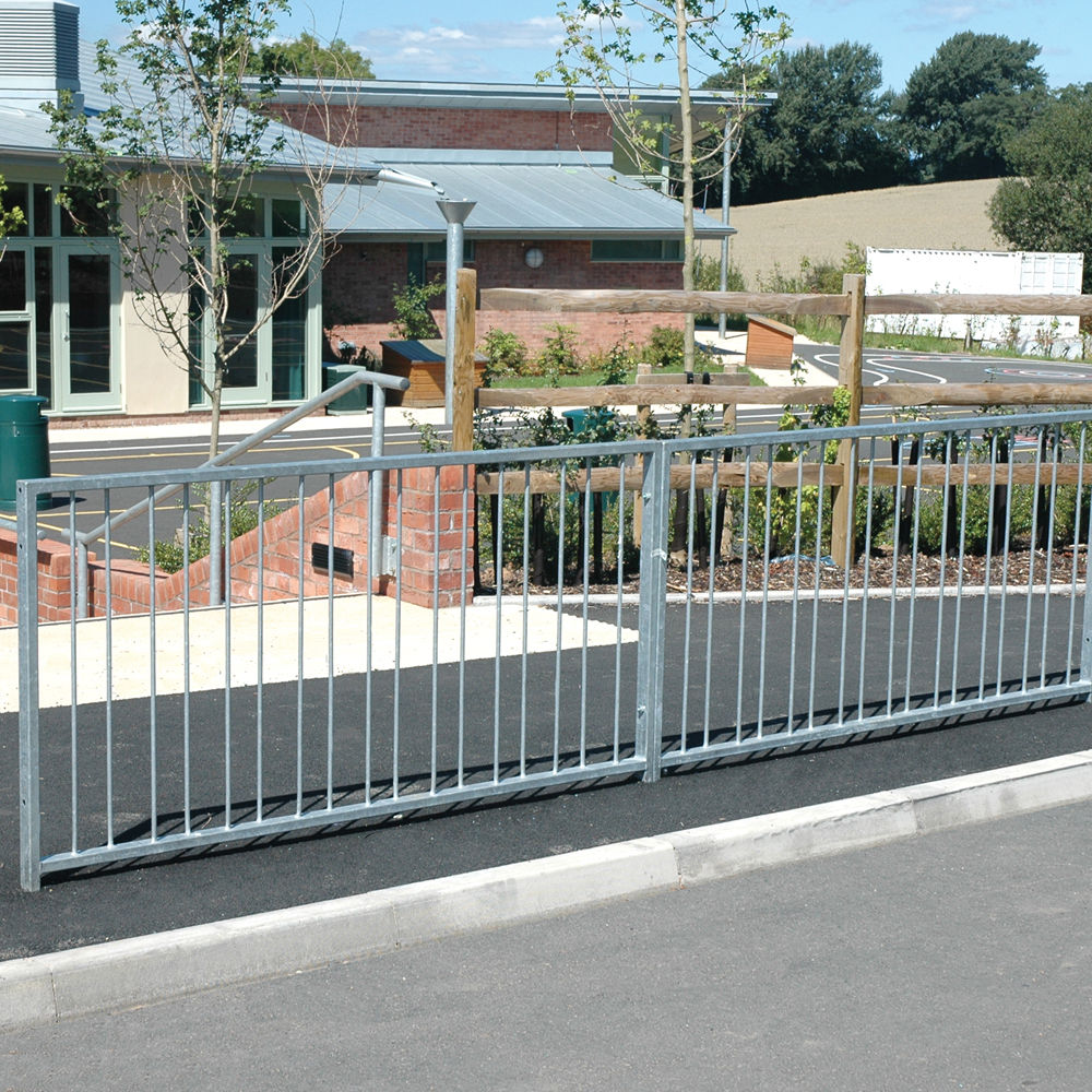 High visibility pedestrian guardrail manufactured from 50 x 30mm box section steel with 12mm infill bars (16mm on request).