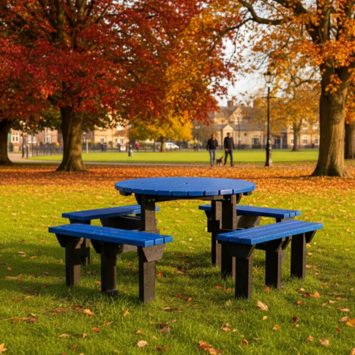 Enjoy outdoor dining with our Stratford Coloured Picnic Unit featuring a vibrant coloured round tabletop and four attached benches. Built with black or brown legs, this eco-friendly design is made in-house for quality and sustainability.